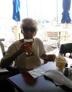 During our Tuesday outing, BJ had a thirst for a beer at a marina. We both longed for a water view with boats. So we headed to Pt. Loma and landed at Southwestern Yacht Club. We wandered into the restaurant and thought we’d take a peek at the nautical view. Low and behold, the waiter agreed to seat us and had a yacht club member host us as his guest, so BJ could order her beer. The waiter treated BJ like royalty–and could not have been more considerate. That act of kindness made my day and I’d like to think that all our nonagenarians are treated with such honor and respect.